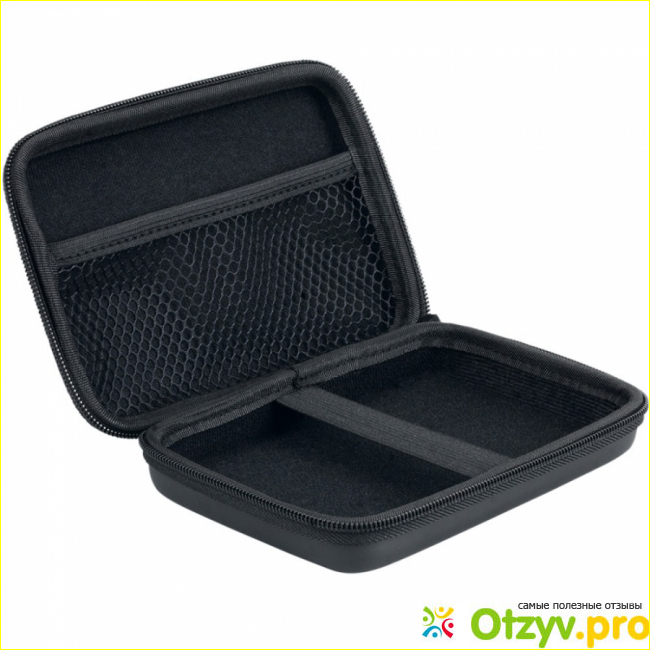 Теперь посмотрим на этот чехол изнутри. После открывания данного чехла перед нами открываются два отделения. Одно из них предназначено для хранения самого жесткого диска, кстати, он фиксируется в этом отделении при помощи специальной резиновой ленты, тоже черного цвета. Второе отделение имеет специальный кармашек из сетчатого материала, в котором можно хранить все необходимые провода к жесткому диску. Благодаря такой конструкции, все имеющиеся внутри чехла предметы не болтаются, закреплены жестко. К тому же чехол внутри имеет мягкую матерчатую обшивку, тоже черного цвета, которая не дает предметам внутри данного чехла повредится.