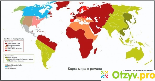Вот в таком мире и жили люди. Тоталитарный режим поглощал многие аспекты жизни. Культура была направлена на арийскую расу. Инакомыслие жестоко каралось. Писатели, которые писали о свободе и т. д., уничтожались, а их работы сжигались. Но было одно произведение в этом рассказе "Когда наестся саранча". Это был роман в романе. Он был тоже из разряда альтернативной истории. Но там как раз все произошло так, как было на самом деле. Т. е. Гитлер войну проиграл, а японцы тоже не смогли одолеть Американцев. В обще гитлеровская коалиция потерпела крах и рейх прекратил свое существование.