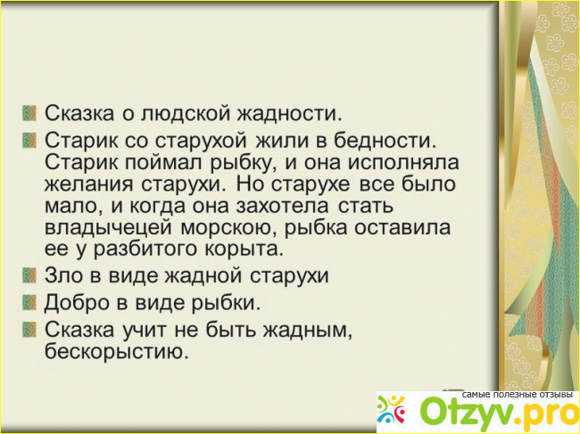 Если ребенок дочитает эту сказку до конца, он с легкостью поймет ее суть и то, в чем состоит поучение. Когда старуха получала власть и новое богатство, она становилась все злее, поэтому школьникам будет достаточно легко сделать правильные выводы о том, что жадность в конце концов будет наказана, и можно снова остаться без всего, что было нажито ранее. Автор пытался вложить в данную сказку максимально глубокий смысл, который мог бы быть понятен даже маленьким детям. Ведь, зачастую эту книгу читают детям родители в младшем возрасте.