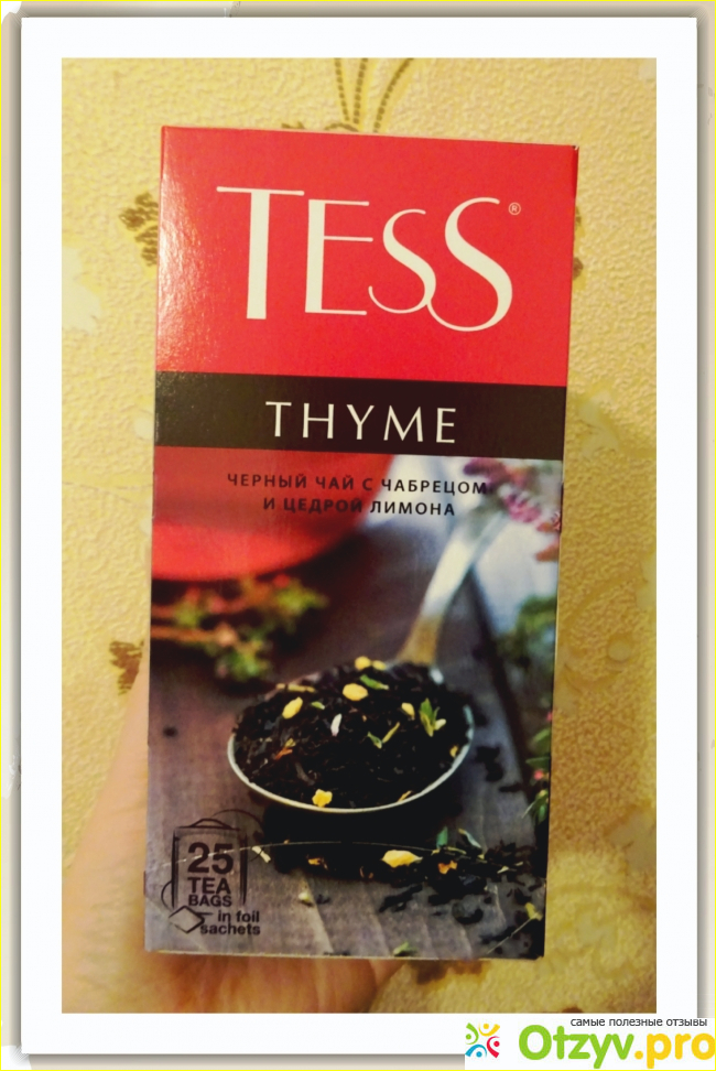 Уже много лет я являюсь поклонницей продукции чайной марки «Tess» (серия "THUME"), производителем которой является российская компания «ОРИМИ». Перепробовав огромного количество вкусовых сочетаний, я выбрала для себя более вкусные продукты, одним из них является «Чёрный чай с чабрецом и цедрой лимона». Этот товар я покупаю, как в обычном супермаркете, но исключительно по акции, так и в магазине сниженных цен «Фикс Прайс» (чаще всего) за 50-55 рублей.