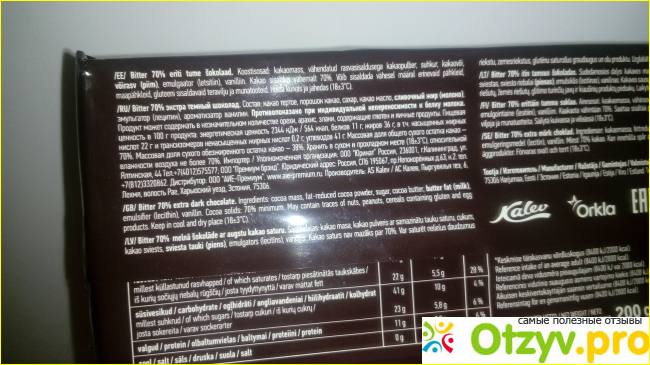 Шоколад действительно темный, соответствует заявленным 70% содержания какао.