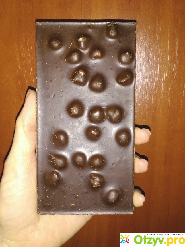 А вот так шоколадка выглядит с обратной стороны. Посмотрите, как аппетитно смотрятся цельные лесные орешки. Фундук обжарен хорошо, равномерно и достаточно - ни больше, ни меньше не нужно. Орешков достаточно много. Все орешки, которые были в данной плитке шоколада оказались хорошего качества, а не залежалые. Фундук не кислил, не горчил, а вполне был вкусен и хорошо сочетался с тёмным шоколадом.