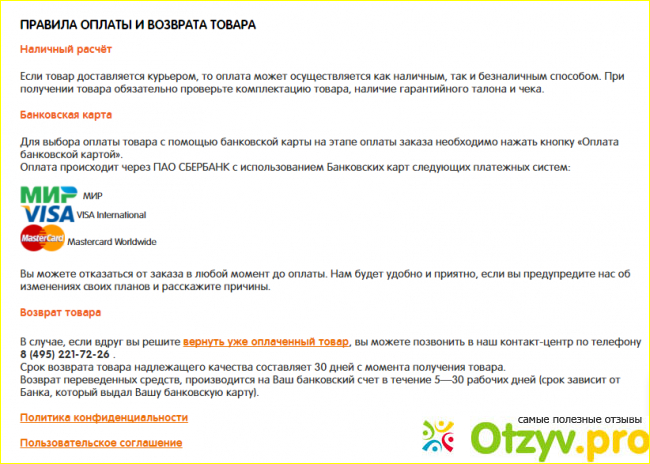 Курьеру можно заплатить наличным и безналичным способом. Есть возможность возврата некачественного товара в течении месяца при условии сохранения чека: