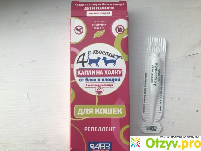 Там сказали, что как вариант - био-препараты и ошейники. Ошейник панически боюсь надевать, мне постоянно кажется, что кошка им зацепится и погибнет. Умом понимаю, что это - глупость, но... Поэтому остановила выбор на био-каплях от блох. Название "4 с хвостиком" сделало своё дело: поулыбавшись, я купила именно эти капли. Нанесла, как написано в инструкции, это очень просто, буквально 2 секунды понадобилось.