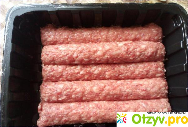 Колбаски упакованы в чёрный лоток из штампованного пластика. Пять небольших колбасок слеплены из фарша, они имеют аппетитный розовый цвет и аромат шашлыка. Диаметр колбасок - примерно 2 см или чуть больше.