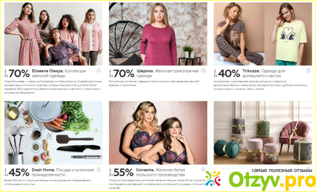 Чаще всего это одежда и различные детские товары. Сам магазин своего рода закрытый клуб, куда необходимо вступить, чтобы приобретать различные известные бренды по большим скидкам. Порою можно существенно сэкономить, особенно, если сравнивать цены с розничными магазинами. Заказы формируются и размещаются, не больше 6 дней, как начинается акция. Если судить по товарам, то этот магазин идеально подходит для молодых мам, которые умеют и любят экономить деньги. Здесь можно приобрести недорогие, детские вещи и игрушки от хороших производителей. Если у вас нет детей, здесь вы всё равно найдёте для себя что-то интересное из женской модной одежды или предметов для домашнего обихода.
