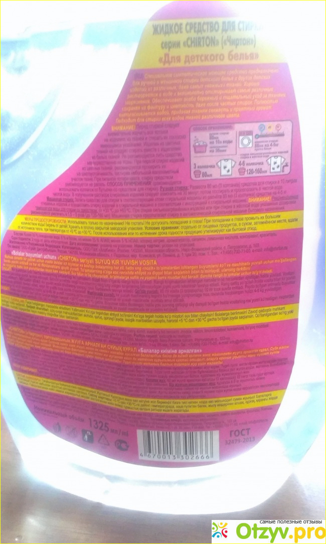 Изготовлено по Гост. Объём так же не стандартный- 1325 мл- какая чёткость удивительно даже. Средство подходит для ручной и машинной стирки. Рекомендуемые температурные режимы: от 30 до 60 градусов. Можно использовать для любых видов ткани.