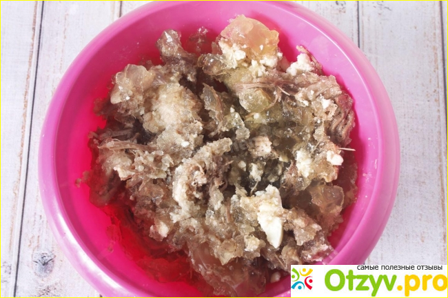 После того, как картошка сварилась, добавляем главный ингредиент закуски. Это тушенка. Натуральная говядина по ГОСТ.