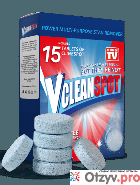 Над разработкой Вклин Спот работали химики. Специалисты смогли подобрать сочетание безвредное для человека, но хорошо справляющееся с биологическими загрязнениями. В основе таблеток находятся поверхностно-активные вещества, которые в отличие от обычных моющих не диссоциируют на ионы, а, следовательно, не остаются на поверхности и не разрушают верхний слой вещей. Они способны: