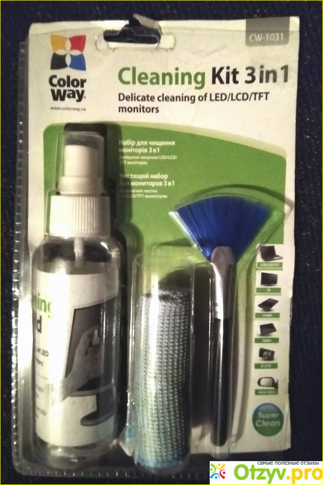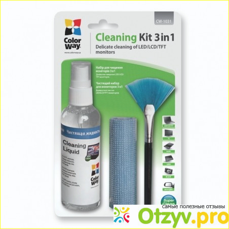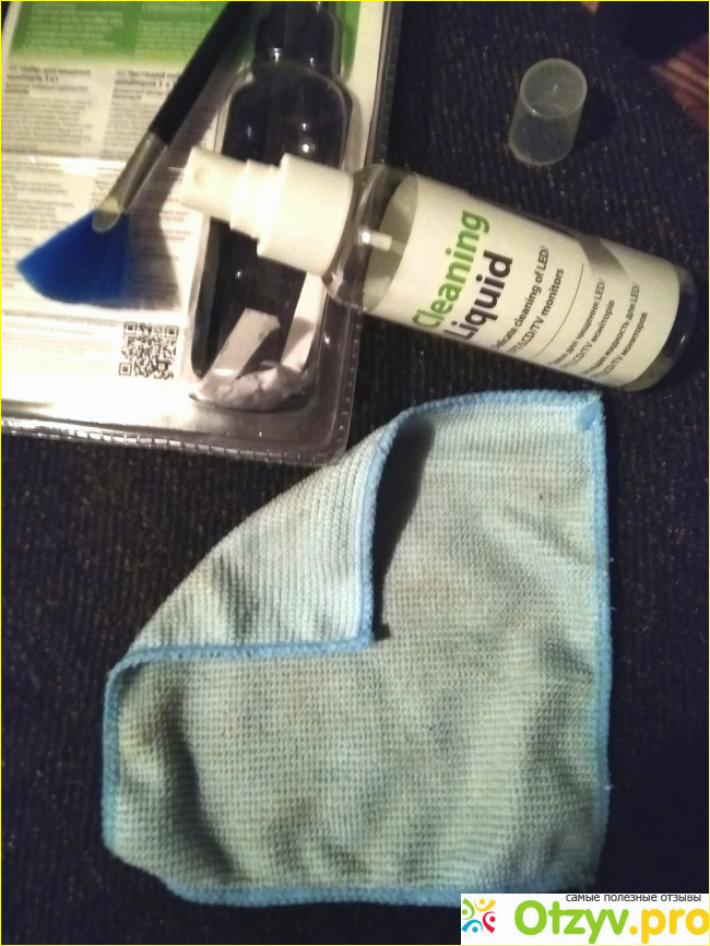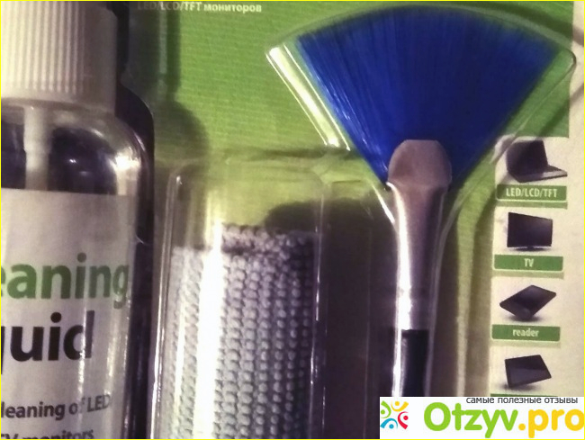Набор мне понравился. Синяя щеточка очень упругая, но мягкая, не царапается. Я ею чищу клавиатуру и иногда смахиваю пыль с фотоаппарата. Она прекрасно пролазит между кнопок. Тряпочка небольшая, мягкая, но толстая. Я ею чищу LED телевизор Sumsung. Разводов и царапин не остаётся. Средство хорошо справляется с поставленной задачей. Особенно это актуально было когда дочка была маленькая и часто оставляла отпечатки ладошек на мониторе.
