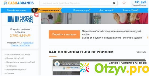 Еще один совет: как и многие крупные торговые площадки, «Читай-город» подключен к сервисам кэшбэка (возвращение части денег после покупки). Лично я в том случае, когда не использую перечисленные выше возможности (карта лояльности, коды на скидку), вхожу на сайт через сервис «Кэшфобрендс». В этом случае на текущий баланс можно получить до 5 % возврата денежных средств от заказа на сайте моего любимого книжного «Читай-города».