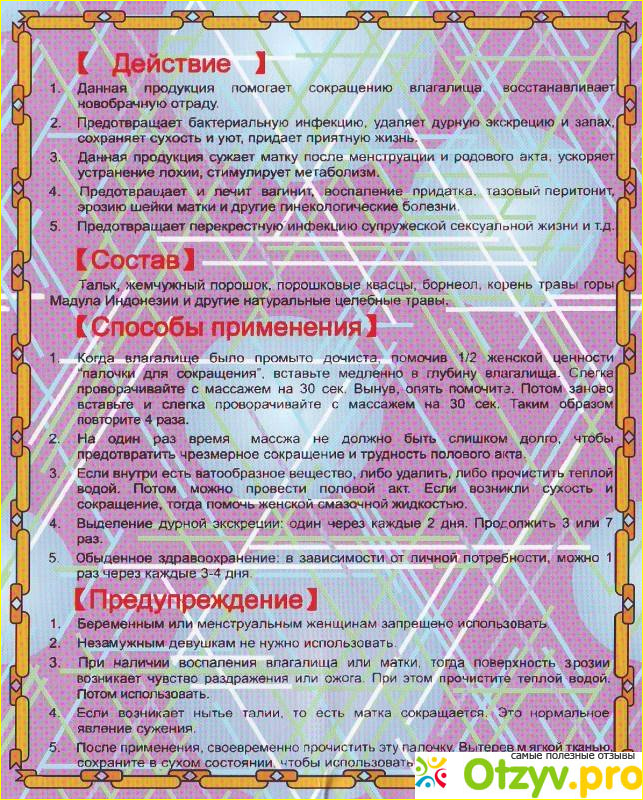 После манипуляций. палочку нужно извлечь, вымыть водой, просушить и брать на хранение. ПАлочка очень хрупкая, и обращаться с ней нужно очень бережно. После использования данного средства внутри влагалища могут появиться пенистые сгустки, которые нужно просто смыть водой. В течении недели палочку можно использовать до трех раз. При появлении ярко выраженных побочных эффектов, от использования палочки стоит отказаться. Здоровье важнее всего на свете, гораздо безопаснее будет заняться упражнениями Кегеля.