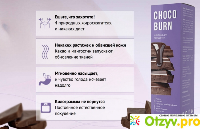 Называется сладкий микс из энергетиков, жиросжигателей, пробиотиков и витаминов – ChocoBurn шоколад для похудения, а состоит он сугубо из натуральных веществ. Принимать его следует курсами, а потерять с его помощью можно от 4 до 15 кг. Результат будет постепенным, зато стабильным. Такое похудение не опасно, как в случае со слабительными таблетками, и не приведет к истощению, таять будет только лишний жир.