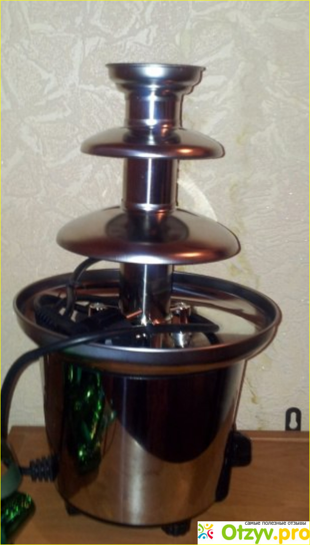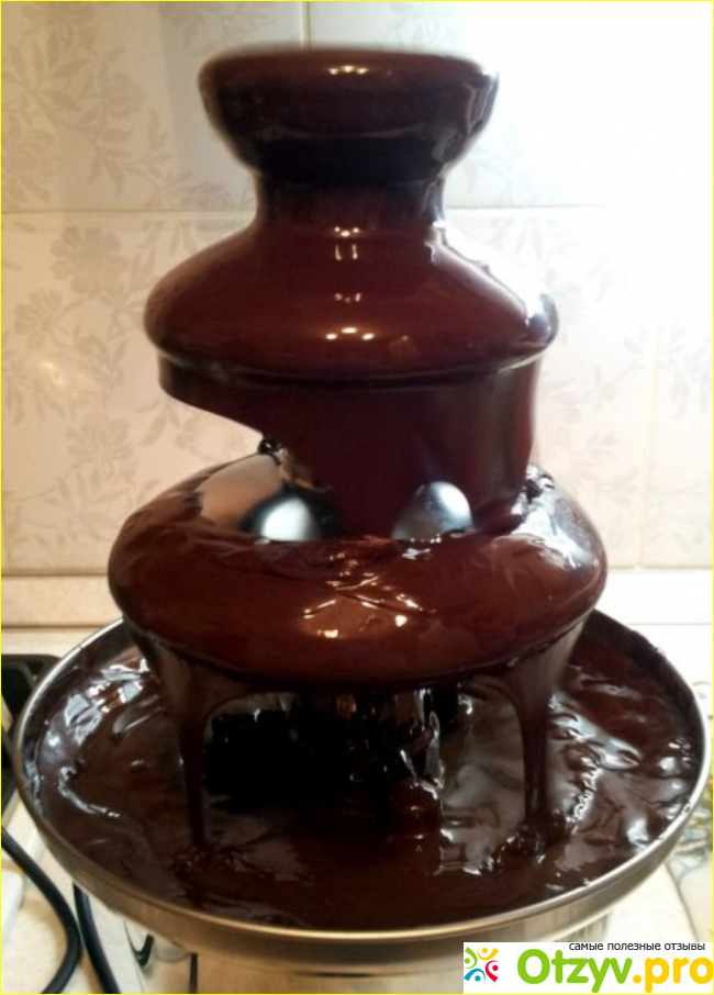 В работе аппарат , очень не простой, и практичный, шоколад во время растекания не брызгает , а плавно стекает сверху по ярусам, поэтому вокруг все чисто.