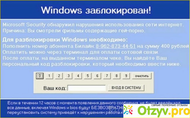 Если вы посмотрите видео снизу, в котором говорится о том, как якобы заблокировали ваш компьютер за правонарушения и даже логотип МВД присабачили, и что самое интересное требуют заплатить штраф в определенном размере и деньги надо отправить на номер сотового телефона. Ну сразу же видно, что это элементарно дело рук мошенников. И многие сразу начинают суетиться, особенно те, кто сидел на порнографических сайтах, дабы не спалиться, и начинают переправлять средства. Ребята, успокойтесь, это всего лишь вирусная программа, которая скачалась и установилась в тот момент, когда вы посещали сторонний сайт. Не надо паниковать, для начала просто перезагрузите ваш компьютер, а при необходимости нужно будет выйти в БИОС, после перезагрузки просто проверяем ваш компьютер с помощью антивирусной программы и удаляем вирус. Вот собственно и все, что нам нужно.