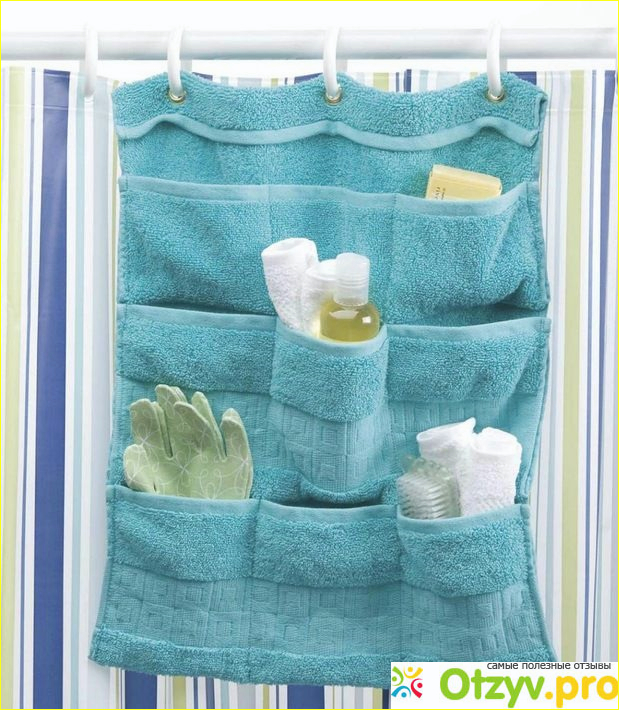 Пришейте к целому полотенцу несколько карманов, петлю для подвешивания и используйте для хранения расчесок, банных мелочей, шампуней и других вещиц.