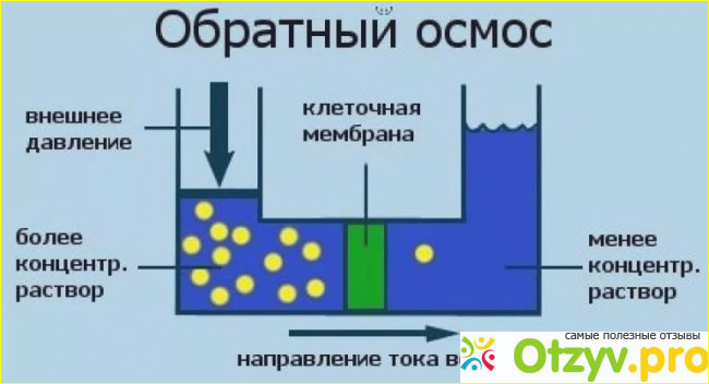Принцип действия обратного осмоса основан на разделении потока исходной воды под высоким давлением, которое в процессе прохождения специальной мембраны под воздействием осмотического давления, делит воду на фильтрат (или пермеат - обессоленная вода) и концентрат (вода обогащенная солями).