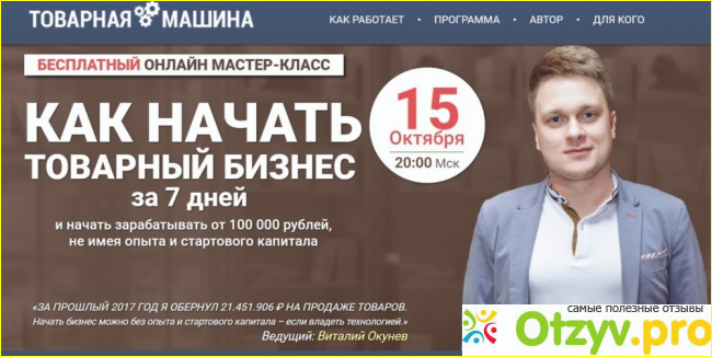 Наверное все, кто мало-мальски интересуются бизнесом в интернете, знают имя Виталий Окунев. И скорее всего, он знаком им по тренингу "Товарная машина". Прежде чем заниматься каким-то делом, необходимо ознакомиться с курсом или тренингом, что он собой представляет? Он может быть обычным информационным бизнесменом, а может быть человеком, который реально принесёт переменной вашей жизни. Это является принципиально важным моментом, с которым следует основательно разобраться.
