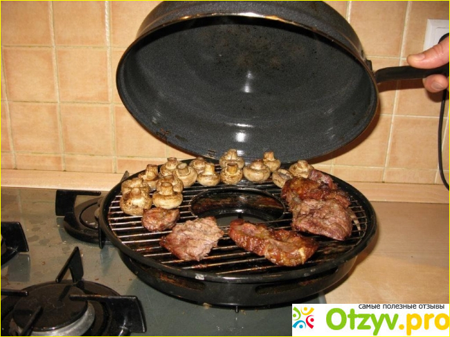 Красивое снаружи, потому что гриль подразумевает решетчатую основу. А главное, можно готовить более диетически. Во первых, потому что на нее необходимо налить воду, а не масло, а во вторых, все излишки жира будут стекать в специальные ячейки, то есть ребра гриля.