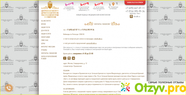 Далее на официальном сайте ЦИДК клиники достаточно крупным шрифтом опубликованы два контактных телефона, по которым все интересующиеся лица, а также потенциальные клиенты данного медицинского учреждения, могут дозвониться и задать все интересующие их вопросы относительно работы данного центра и оказываемых здесь услуг. Помимо самих телефонов чуть ниже указан адрес электронной почты, на которую клиент клиники может написать по тем же самым вопросам. В этой же части страницы, прямо над контактными телефонами, имеется крупная кнопка, которая для привлечения внимания даже выделена ярко красным цветом. По ней предлагается записаться на прием к врачу-косметологу, работающему в данном центре красоты. Перейдя по этой вкладке, перед вами открывается поле, где вам требуется заполнить некоторые личные данные (фамилия, имя, отчество, контактный телефон). Также вам здесь необходимо будет написать текст, то есть суть вашего обращения в данную организацию и уже после всего этого нажать на кнопку "Отправить". В ближайшее время ваша заявка будет обработана и вы попадете на прием к тому или иному врачу. Если же вы хотите ускорить процесс, то проще будет сразу же позвонить по контактному телефону, указанному на официальном сайте ЦИДК клиники чуть ниже.