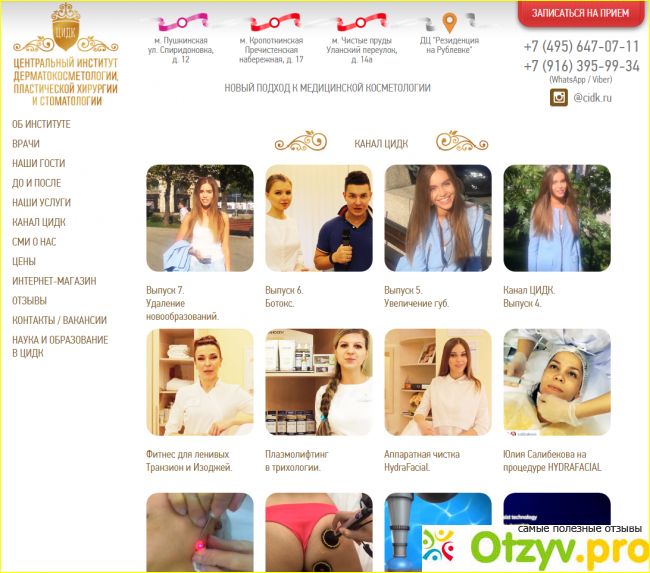 В разделе официального сайта ЦИДК клиники, посвященному каналу данного лечебного учреждения, рассказываются, что в нем используются новейшие, самые современные технологии лечения заболеваний, коррекции различных частей тела, разравнивания морщин, уменьшения целлюлита, увеличения объема груди и губ, удаление шрамов и рубцов и многого-многого другого. Здесь же приведены и фотографии всех этих процедур, а также небольшие по своей продолжительности видео-ролики.