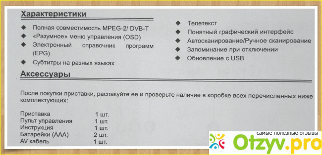 Дача у нас за пределами города и мы там бываем не каждый день и тратить деньги на кабельное телевидение не выгодно, к тому же, оплата постоянно дорожает. А эта приставка, как раз самое то, что и надо. Это совсем не большой, можно сказать очень миниатюрный цифровой приёмник в аккуратном дизайне, чёрного цвета. Места занимает по минимуму. Смотрится не громоздко, очень лёгкая по весу и отлично вписывается в интерьер комнаты. При покупке, это была не большая картонная коробка в которой был пульт дистанционного управления; руководство по эксплуатации, в котором очень подробно изложено, как подключить приставку к телевизору; специальный кабель "Тюльпан" и адаптер. К пульту в комплекте шли и две батарейки.