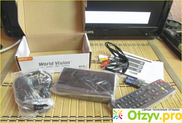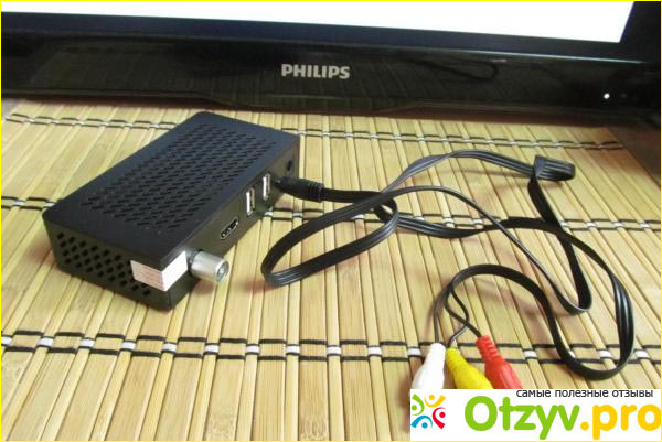 Приставка поставляется в фирменной коробке, имеющей размеры 18 х 10,5 х 6 сантиметров. Кроме ресивера в комплектации здесь присутствуют блок питания, кабель мини-джек /3RCA (тюльпаны), пульт дистанционного управления универсального типа, элементы питания, руководство по пользованию и гарантийный талон. Чтобы был талон гарантии следует следить обязательно, чтобы если произойдет какая-то поломка, вы не остались потом с носом, если устройством что не так.
