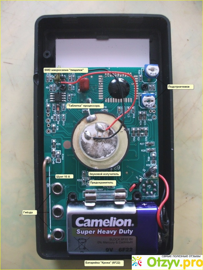 Батарейка прослужит долго, фактически весь свой срок годности. Некоторым неудобством является то, что добраться до неё можно лишь разобрав прибор, сняв нижнюю крышку. У прибора есть защита от перегрузки, она срабатывает при примерно десятикратном её превышении, но этого иногда бывает недостаточно. Будьте внимательны. Если Вы ошибочно попытаетесь воспользоваться прибором, стоящем в режиме измерения тока как вольтметром, сгорит предохранитель, но и он не всегда надёжно защищает схему прибора. Я знаю немало случаев, когда ценой такой ошибки был безнадёжно угробленный прибор - сгорает бескорпусная микросхема. Но так спалишь любой мультиметр! Этот хотя бы не так жалко, так как он недорогой.
