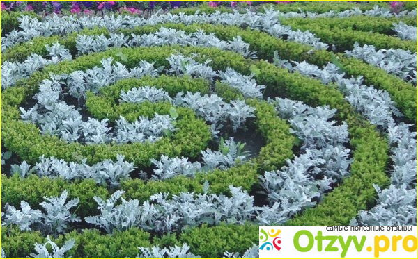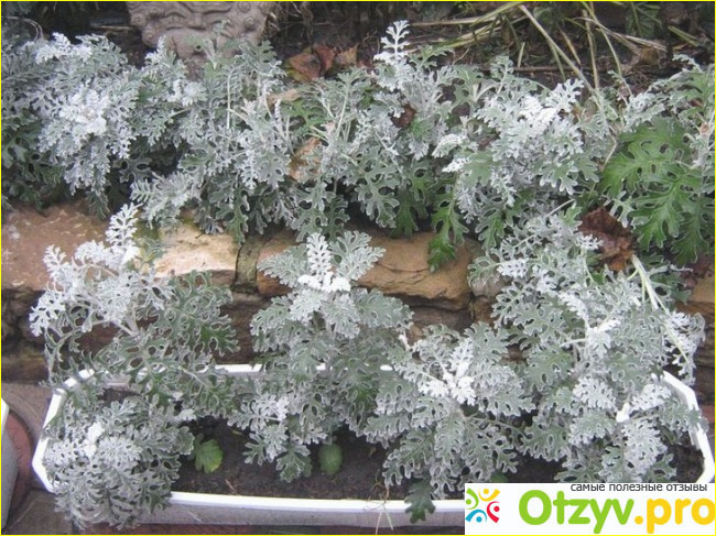 Цинерария приморская совершенно не похожа на свою вышеописанную родственницу. Она имеет очень красивые резные листья серебристого цвета. Соцветия у нее состоят из невзрачных желтых цветков которые зачастую только портят ее внешний вид, поэтому их рекомендуется попросту удалять.