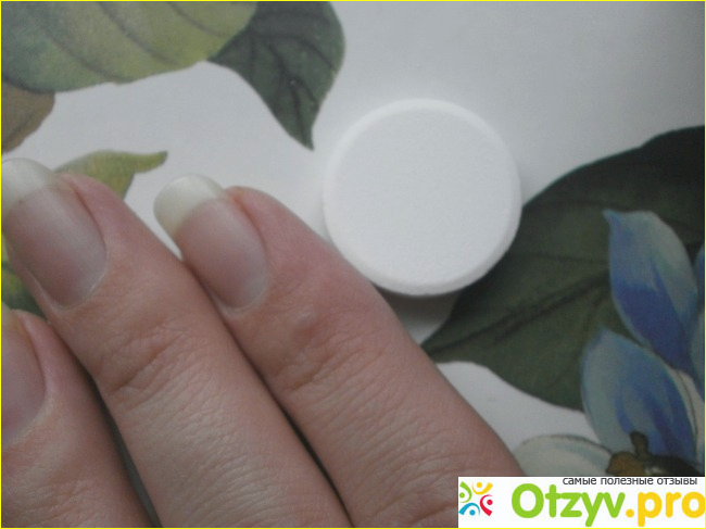 Сама таблетка очень большая, но это не имеет никакого значения, поскольку глотать или жевать её вам не нужно, стоит только залить водой и она сама растворится полностью. Когда таблетка растворяется, то сильно шипит и даже летят маленькие брызги воды из стакана. А затем, когда таблетка растворится, в стакане много маленьких пузырьков остаётся. В общем, слабая такая газировочка получается.