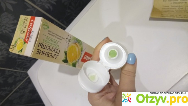 Упаковка интересная, привлекла внимание своим нестандартным цветом (по сравнению с другими пастами этой же марки). Сама коробочка бежевая, матовая - выглядит очень нежно, лишь название выделяется на этом фоне ярко красным. В центре внимания на упаковке лимончик среди зелени. Информации на коробке не много, о производителе, о составе, о применении. Внутри упаковки туба объёмом 75 мл. Надо сказать очень удобная штука - туба с отщелкивающейся крышкой, не нужно отворачивать и заворачивать, для лентяев вообще находка)