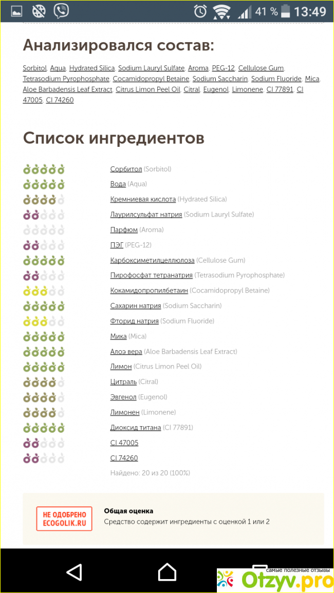Оказывается паста не так хороша в плане безопасности для организма. Экосайт её не одобряет. Какие компоненты были забракованы?Лаурелсульфат натрия - является сильным аллергеном и может раздражать кожу и слизистую. Ароматизатор. Непонятно какой использован тут? Если он натуральный, то нет претензий, а если синтетический, то это не очень хорошо. Уважаемый производитель, укажите пожалуйста какой используете ингредиент! Повышает проницаемость кожи. ПЭГ увеличивает риск фото- и светочувствительности, опасен для поврежденной кожи, может вызывать раздражение кожи и аллергическую реакцию. Пирофосфат тетранатрия - может накапливаться в организме. Вредит окружающей среде. Может вызывать раздражение кожи и глаз, аллергические реакции. Цифровые компоненты это красители (жёлтый и зелёный) и они в больших количествах очень вредны для организма.