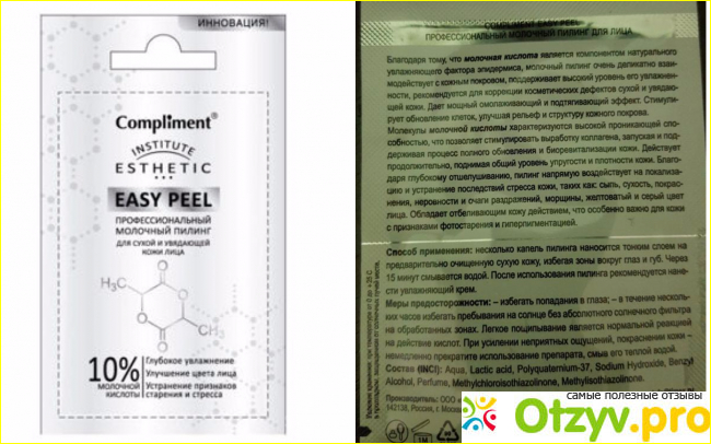 Саше с маской, 7 гр. Согласно описанию производителя, основным компонентом пилинга является 10 % молочная кислота. Пилинг представляет собой однородную, гелеобразную массу светлого цвета, обладает приятным ненавязчивым запахом. Содержимого хватит на 2 использования точно. Нанести средство рекомендуется на 15 минут, затем смыть обычной водой, нейтрализатор наносить не нужно.