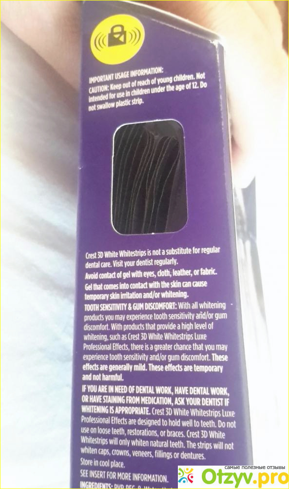 Когда полоски находятся на зубах, они не отваливаются, никуда не сползают. Если будет ощущение болезненности, можно использовать зубную пасту для чувствительных зубов и наносить её прямо на те зубы, где чувствуется дискомфорт, втирать, можно подержать какое-то время - ощущение болезненности уходит.