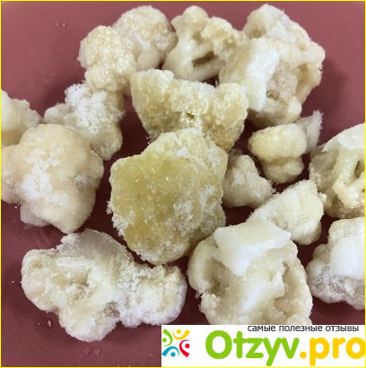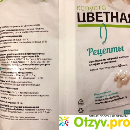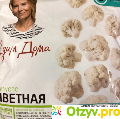 Вот такую капусту я купила вчера. Продукт для меня новый. Такого производителя я не знаю. На упаковке яркий призывной лозунг “едим дома” и название ТМ “Планета Витаминов”. Дизайн пачки весьма прост. На белом фоне помимо надписей изображена улыбающаяся женщина, которая, скорее всего, не пробовала овощи, на упаковке с которыми ее напечатали. На обратной стороне пачки состав и общая информация о пищевой ценности и производителе. В составе только соцветия цветной капусты. Никаких добавок и других неприятных сюрпризов не заявлено. Внутри упаковки несчастные соцветия разного размера. Почему несчастные? Посмотрите на их неприглядную и неестественную желтизну и ледяную глазурь. Про снег в упаковке я вообще молчу. Выглядит не очень, согласитесь. Помимо пожелтевшей от времени и неправильной заморозки капусты и снега меня удивило, а точнее неприятно поразило и то, что некоторые соцветия обломаны, словно их кромсали ножом. В пюре такое, конечно же несущественно, а если добавлять капусту в рагу или другие блюда целиком, в итоговом варианте будет смотреться некрасиво. На вкус продукт оказался странным. Кисло-горький привкус не исчез даже после длительной варки.