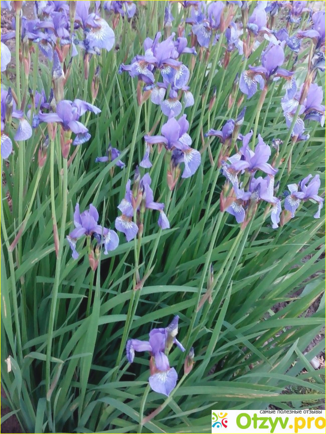 Очень красивый куст высотой больше полуметра. Листва острая, тонкая, прямая. Во время цветения над листвой появляются нежные красивые цветы. образующие яркое синее пятно и словно синее облако парят над листвой. Цветение правда не очень продолжительное, в среднем около двух недель. Многое зависит от погоды, при ярком солнце цветение отходит быстрее, а в полутени как-то и цветы кажутся более яркими и цветение более продолжительное. У меня растут эти ирисы с западной стороны дома, где солнце появляется только после обеда, правда и зацветают тут цветы чуть позже, чем на южной стороне.