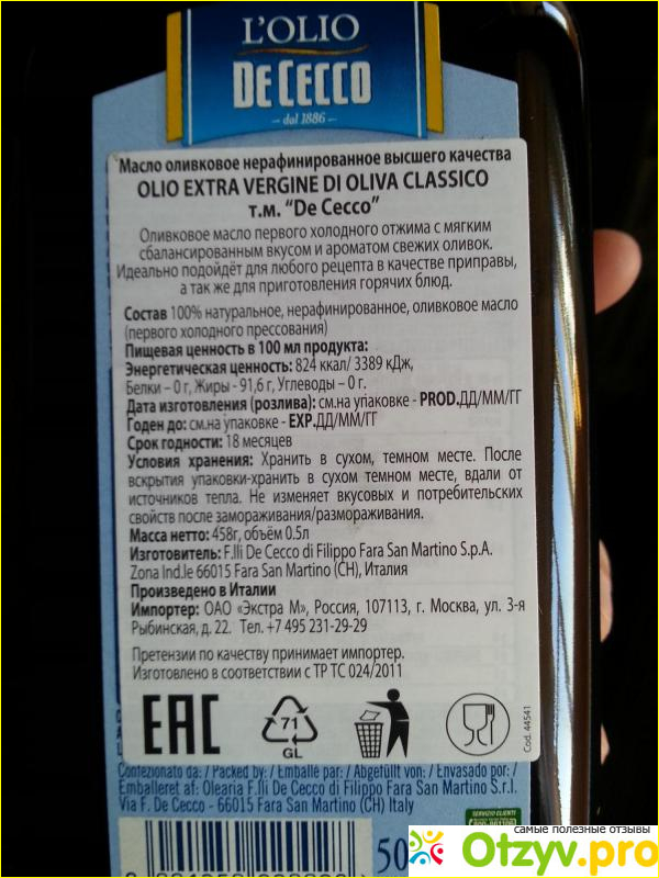 Маргерита. Как любительница полезных продуктов, для себя я решила, что для салатов, а также для приготовления пищи отныне использую только оливковое масло. Я уже тестировал совершенно разные виды оливкового масла от разных производителей, но я все еще нахожу, потому что все, но это не так, как должно быть идеальным маслом. А в предпоследний образец испанского оливкового масла я плюнул до последней капли. на вкус он был резким. И недавно я пришел к выводу, что итальянское оливковое масло все же лучше, по крайней мере, во вкусе наверняка, у меня будет возможность увидеть пример этого итальянского масла. А теперь я хочу рассказать вам еще об одном оливковом масле (конечно же только первого холодного отжима - лучше) итальянского производства. Это не самая известная российская марка масла De Cecco. Первое, что мы видим, глядя на бутылку, что она сделана из темного стекла (темно-зеленый), хорошо, потому что любые продукты, которые были сохранены лучше, если он не получает или получает минимальный солнечный свет и, как правило, в любом свете. Тем не менее, эта упаковка может сказать нам, что это правда, что оригинальное масло, а не подделка, потому что бутылка спереди и сзади этикетки имеет выпуклое украшение в виде ветки оливы, а на боковых сторонах бутылки написано - название производителя. Согласитесь, на что производитель подделок постарается потратить деньги на упаковку?Продолжайте идти. В процессе написания оливковое масло первого холодного отжима всех производителей. Что они делают:Но различные исследования в области нефти, каждое из которых было проведено и результаты, которые меня интересуют, свидетельствуют о том, что это не всегда верно. Чтобы попробовать, самый простой и интуитивно понятный, что я трачу каждый новый тип оливкового масла для меня. Я поставил бутылку масла в холодильник на ночь. Как известно, растительный воск, который является качественным продуктом от низкой температуры застывает, и внешне он выглядит как белесые хлопья, которые плавают в слегка загустевшем масле. И натуральное оливковое масло De Cecco extra virgin Extra Vergine di olive Classico должно быть подвергнуто этому тесту. Надо сказать, живут. Утром масло приобрело мутный вид и на нем повисли "восковые хлопья", пусть и не полбутылки, но все же. И конечно же любое приличное масло простояв один час при комнатной температуре, оно вернуло себе первоначальный вид. Стал желтым и прозрачным. Я заметил, что итальянское оливковое масло обычно желтого цвета, в то время как испанское и греческое имеют немного зеленоватый оттенок. Не говоря уже о качестве продукта. Но именно в районах произрастания и видов оливок. Вкус этого масла мягкий и не горький, конечно есть некоторые особенности вкуса оливкового масла, но их можно смело выливать на салаты и не бояться, что потом вкус этой заправки к салату можно отправить в мусорку. В общем, дело в том, что масло не так уж и плохо. Однако, это также не идеально. Ну а недавно у меня появился еще один экземпляр оливкового масла - по сравнению с этим, просто небо и земля по своему вкусу.