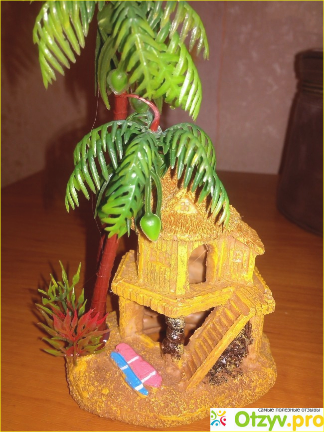 И вот что я обнаружила, когда раскрыла упаковку. очаровательная хижина из какого-то материала, похожего на керамический. Если честно, сильно разбираться не стала, сразу же слегка промыла домик и поместила в аквариум. Размерам, указанным продавцом, полностью соответствует. В мой маленький аквариум подошёл идеально. Очень понравилось то, что рядом с хижиной даже есть миниатюрные досочки для виндсерфинга. А кроме того, возле хижины ещё и есть растительность - кустик и пальмочка. А то я думала заказывать травку для аквариума отдельно. Не хотела натуральные водоросли - слишком уж много мороки с ними чистить аквариум. А такая искусственная растительность намного и удобнее и красивее.