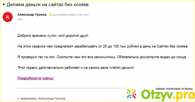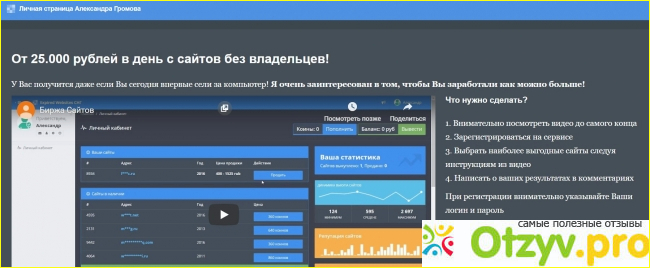 Этот лохотрон одним сайтом не ограничивается, Александр Громов наверняка персона вымышленная. Фраза "Делаем деньги на сайтах без хозяев" предполагает имитацию деятельности по купле-прожаже дропов (брошеных доменов бывших в употреблении). Ранее считалось, что они трастовые, способны сразу "разогнать сайт", если не обременены санкциями.