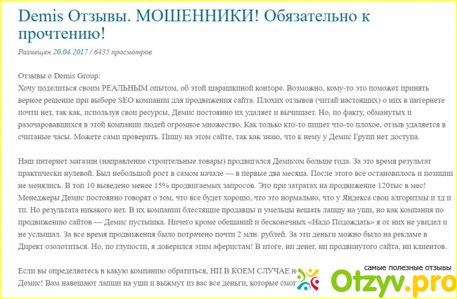 ОтзывыПервой же строчкой, если вводить в поисковую строчку Яндекса "Demis Отзывы", то можно обнаружить статью с негативными впечатлениями пользователей об этих людях. Один из владельцев Интернет-магазина выразил свое недовольство, поскольку его проект появился в рекомендациях только первое время, а далее показатели пошли резко вниз.