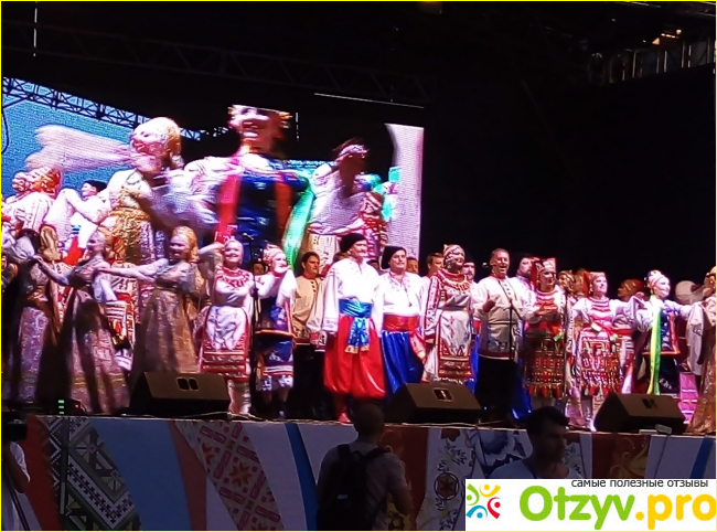 На большой сцене концерт с номерами. Моя дочь занимается кавказскими танцами, мы пришли посмотреть на них, как они танцуют лезгинку. Кроме того русский народный хор. Как только он встал, все замерли. Выступали ярко еврейские, татарские, немецкие, башкирские коллективы.