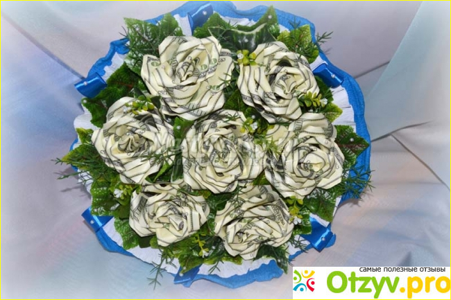 Для девушки же более оригинальным и красивым покажется букет, который вы сможете сделать своими руками, используя всю ту же технику оригами, только теперь для изготовления цветов. Для того, чтобы такой букет смотрелся более «свежо» и красиво, старайтесь брать более новые, мало бывавшие в употреблении банкноты. Для создания такого букета вам потребуются: несколько бумажных банкнот, заготовки из пенопласта или лист форматом А4, зубочистки, маленькие тонкие резиночки. Технику оригами можно найти на некоторых специализированных сайтах, но я опять-таки рекомендую посмотреть более подробное видео в интернете. Когда все бутончики из купюр будут готовы, очень рекомендую собрать их в красивый букет, обернув праздничной ленточкой, а к таким дорогим искусственным цветам воткнуть в букет настоящие лепестки, хотя для долговечности больше подойдут искусственные.