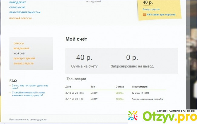 Как видим, получается у меня 10 рублей на счету за заполнение профиля и 30 рублей за опрос. Кстати опросы достаточно интересные, не нужные. И на заполнение по идее уходит 20 минут. Конечно 30 рублей за 20 минут времени - это копейки. Даже если сравнить с данным сайтом, то тут достаточно интересные условия заработка. Однако думать на опросах много не надо, отвечаешь себе на вопросы и получаешь деньги.