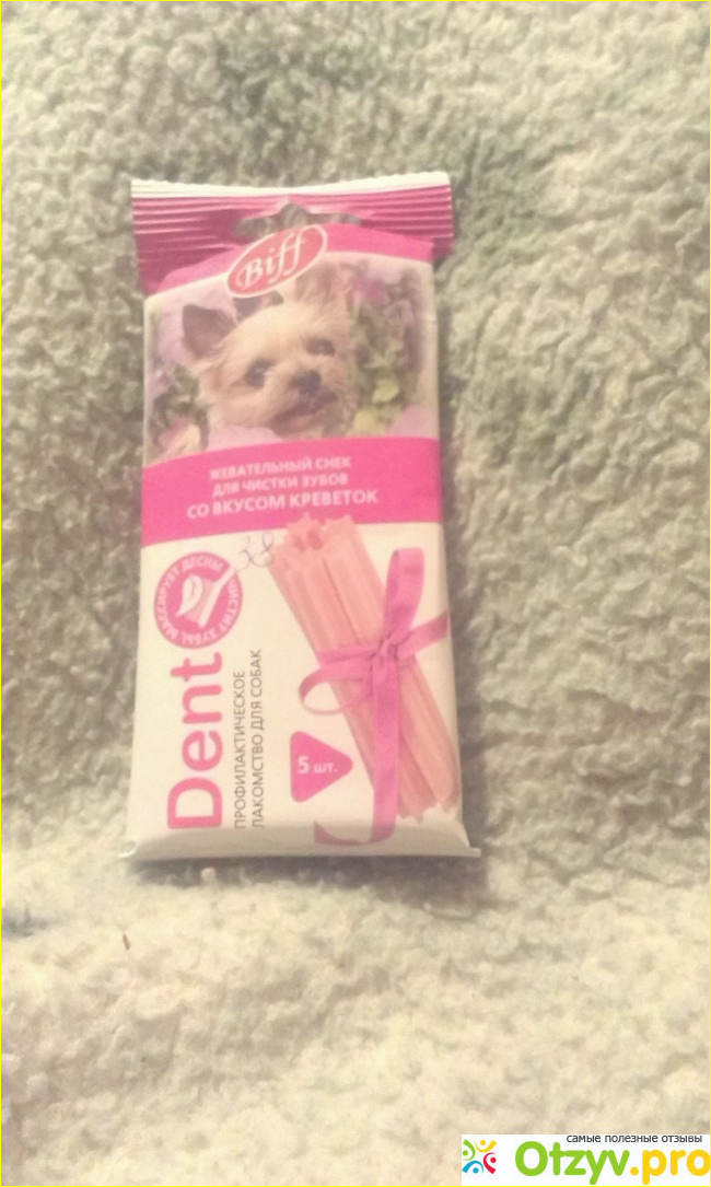Так как собака у меня мелких пород, то и соотвественно и подбираю я лакомство для мелких пород. В одной упаковке 5 маленьких палочек: жевательных снеков. Лакомство является профилактическим, то есть лечебного действия у него нет . Какое же действие оказывает на зубки собаки такие лакомства:снимают мягкий зубной налёт, снижают уровень зубного камня, массажируют дёсна.