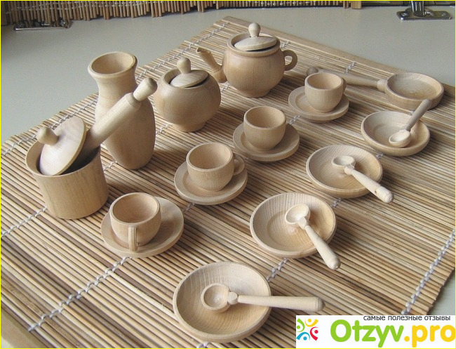 Но вот у нас допустим есть вот такой детский деревянный наборчик для чаепития, кукольный. Данный набор рассчитан на 4 персоны, в комплект входит 22 предмета: 4 чашки, 8 тарелочек, ложки, сковородка, кастрюля с крышкой, кувшин, чугунок , скалка.
