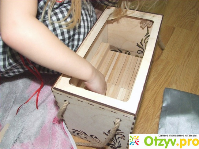 "А давай ка дружок сложим все дощечки аккуратно в коробку!". И тут ребенок с удовольствием начинает аккуратно складывать дощечку к дощечке в ящик.
