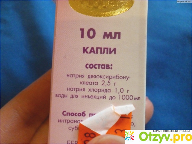 Основным активным веществом у препарата считается экстракт молоки осетровых рыб, а именно натрия дезоксирибонулеата. Но вот что странно, считается, что препарат абсолютно безопасный и его можно применять детям даже с самых первых его дней. Но вот все же противопоказания имеются - это индивидуальная непереносимость активного вещества, только вот в чем она может проявляться - не пойму. В упаковке помимо капельницы с лекарством идет также инструкция по применению на русском языке, с которой я вам советую в срочном порядке ознакомиться. Что касается курса лечения, то тут надо проконсультироваться с лечащим врачом-педиатором, именно он сможет точную дозировку указать.