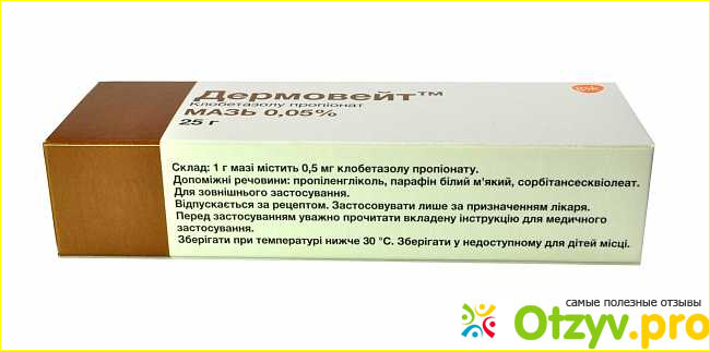 Дермовейт - это препарат в виде мази для наружного применения с противовоспалительным воздействием. Препарат содержит следующие вещества в порядке их приоритетности : клобетазола пропионата, глицерил моностеарат, пропиленгликоля глицерил олеат, цетостеариловый спирт, пропиленгликоль, хлорокрезол, натрий цитрат, лимонная кислота и другие вспомогательные вещества. Выпускается мазь, как правило, в 25 грамовом тюбике.