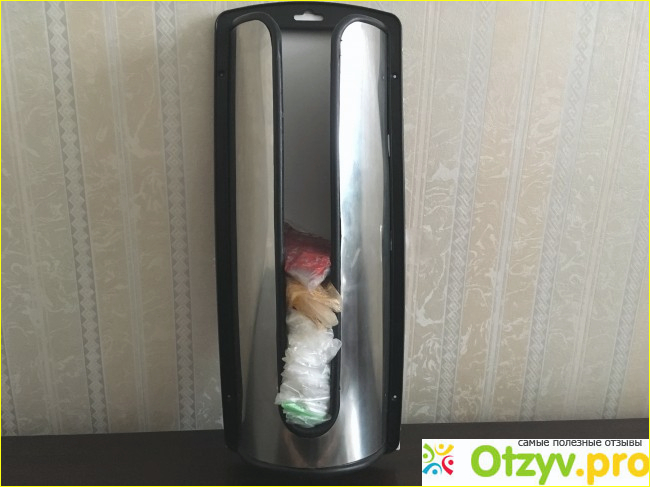 К недостаткам конструкции можно отнести отсутствие задней стенки. Если задняя поверхность держателя неплотно прикреплена к стене, маленькие пакетики выскальзывают из него.