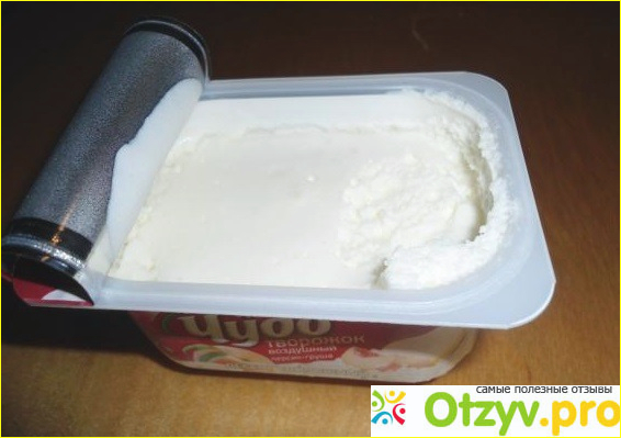 Когда открываешь баночку, то слюнки текут сами собой, просто творожок очень аппетитно выглядит уже и без джема. Он беленький, воздушный, наподобие суфле сделан, только не такой густой. Пахнет нежно, творогом. Но на вкус это очень нежный творог, не кислый, очень вкусный, уминаешь его просто за две секунды.